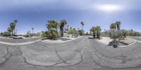 A modern residential area in Palm Springs, California. Lush green vegetation surrounds a low-profile, mid-century home. The clear sky casts a shadow on the empty parking lot. An idyllic suburban landscape.