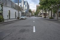 Empty street in the heart of downtown Los Angeles, lined with modern office buildings and storefronts. Straight road stretches into the distance, surrounded by the urban buzz of city life. Clouds dot the California sky.