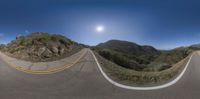 a fish eye shot of a highway going through some mountains in the distance in a 360 - camera lens