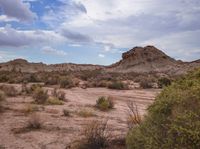 a dirt field with a rocky outcropping and plants in the background with rocks in the distance