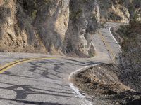 This is an image of a road winding through the mountains in California, USA. The road surface is made of smooth asphalt and follows the natural curve of the rocky terrain. The landscape is characterized by low-lying yellow grass, tall trees, and high peaks in the distance. The geology of the area is rugged, with the road passing through a fault line. This photo captures the beauty of California's mountain pass, showcasing the elevated scenery and the S-curve of the thoroughfare.