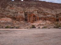 Rugged mountain landscape in California, USA. The brown terrain is highlighted by rocky cliff formations. Open spaces and gravel surfaces make it perfect for off-road adventures. Grey sky adds to the gloomy atmosphere.
