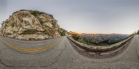 Aerial view of a mountain road in California, surrounded by stunning natural landscape. The road cuts through the highland, with grassy slopes and woody plants on either side. Cloudy skies add a dramatic touch to the scene.