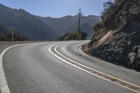 A scenic drive through the Malibu Mountains in California. The asphalt road winds its way through the beautiful mountain landscape. Clear skies and nature surround the winding mountain pass.