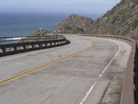The scenic Pacific Coast Highway in Big Sur, California. Winding road with two lanes along the coastal edge, offering breathtaking views of the ocean. Two cars drive along the highway, under a grey sky.