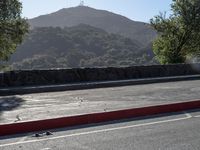 a person skateboards down the street with a mountain in the background at dawn and late afternoon
