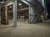 This is an image of a barn interior in rural California, USA. The wood floor and ceiling are illuminated by artificial light, creating a warm and inviting space inside the barn. The clear sky outside can be seen through the glass panel in the barn door, providing a glimpse of the night sky. The concrete walls and metal shed in the background add an industrial touch to the rustic interior design. This photo captures the unique blend of country charm and modern architecture found in rural California barns.