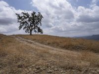 a small cow walks along a dirt path across a dry grass field with trees on one side and mountains in the background