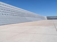 the sidewalk is lined up with concrete blocks and a blue sky above it on a sunny day