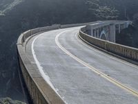 A stunning view of California's Pacific Coast Highway surrounded by coastal mountains and the vast ocean. The Bixby Creek Bridge curves gracefully over the water, offering a scenic drive along the elevated highway.