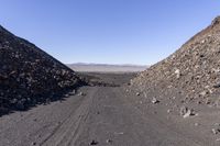 Rugged desert landscape in California's Pisgah Volcano area. Rocky dirt road leads through open space with mountain landforms in the distance. Clear sky contrasts with the rocky terrain. An off-road adventure awaits.