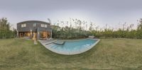 A modern residential property in Los Angeles, California. The circular pool and elevated patio area with a waterfall create a serene atmosphere in the backyard. The open space and clear sky enhance the architecture's reflection. A perfect California day.