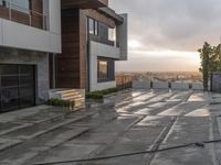 A wet residential street in Los Angeles under a grey sky. Modern architecture merges with the surrounding natural elements. The rain-soaked open space highlights the beauty of the concrete buildings and the lush greenery.