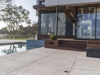 Modern architecture home in Los Angeles, California. Glass-walled outdoor patio offers stunning views of the pool, with wooden benches and a fire pit. The perfect combination of interior design and outdoor living in a residential area.