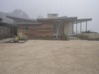 This is an image of a residential area in Los Angeles, California, USA. The modern architecture of the houses is complemented by the open spaces and lush landscaping. The concrete and asphalt road surfaces lead to the driveways and courtyards of the homes. The foggy and gloomy atmosphere adds a unique charm to the landscape. This photo represents a typical dawn scene in a suburban neighborhood. It showcases the beauty of the residential properties and the natural vegetation in the area.