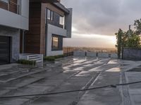 A modern villa in Los Angeles, California, with its concrete surface reflecting the wet sidewalk. The grey sky at dusk adds to the atmospheric ambiance of the residential area. A skateboard adds a touch of urban living.