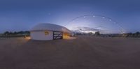 A beautiful California evening in a residential area. The round building is illuminated with artificial lights, creating a warm and inviting atmosphere. Surrounded by trees, it offers a peaceful escape.