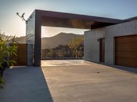 A modern residential building in Los Angeles, California. The concrete architecture blends in with the surrounding landscape. Clear sky lights up the property, while trees provide a rural touch. The villa features an electric charging station, perfect for recharging vehicles.