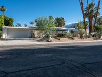 This is an image of a modern residential home in Palm Springs, California. The house features a sleek design with modern architecture and a driveway leading up to a parking garage. The clear sky and the palm trees in the background create a beautiful contrast against the desert landscape of the Sonora Desert. The image captures the essence of suburban living in Palm Springs, with its mid-century villas and well-maintained driveways. This photo represents the sunny and luxurious lifestyle of Palm Springs, known for its iconic architecture and stunning natural surroundings.