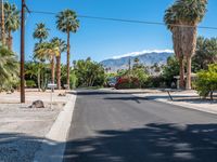 This image showcases a low, modern residential home with mid-century architecture in Palm Springs, California, USA. The house is situated on a suburban road lined with palm trees and surrounded by the Sonora Desert. The clear sky overhead highlights the sleek lines and design of the villa. This photo captures a typical day in Palm Springs, representing the unique blend of modern architecture, natural surroundings, and the relaxed atmosphere of Southern California.