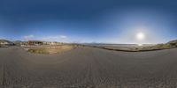 A panoramic view of a residential neighborhood in California, USA. The low coastal mountains provide a stunning backdrop to the houses and open spaces. The calm ocean waves and clear sky enhance the serene atmosphere of this picturesque town.