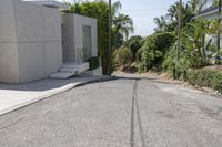 This image captures a clear day in Los Angeles, California, USA. The photo shows a straight road lined with modern residential properties in the Hollywood Hills. The low angle perspective gives a unique view of the architecture and the straight road leading towards the horizon. The road surface is made of smooth concrete and asphalt, contrasting with the green grass and trees on the sides. This picture represents the modern and vibrant real estate in Los Angeles.