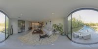 Modern architectural masterpiece in Los Angeles, California. This stunning villa features a spacious living room and dining area with a view of the outdoor pool. The interior design showcases a blend of nature and contemporary elements.