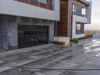 A large modern villa in Los Angeles, California. The wood and glass doors provide a sleek facade against the wet concrete patio. This residential property is surrounded by modern architecture.