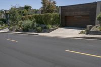 An empty residential street in Los Angeles, California. Modern architecture and low-rise houses line the road in this peaceful neighborhood. Clear sky above the Hollywood Hills adds to the serene atmosphere.