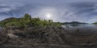 a 360 - shot picture showing the view of a river, and an island in the background