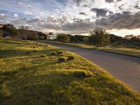 A scenic view of a paved road in California, surrounded by lush green grass and trees. The modern architecture of residential buildings contrasts with the natural environment. The break of day provides a beautiful landscape.