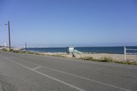 A coastal road in Santa Monica, California, stretching along the sandy beach and clear blue ocean. The horizon meets the clear sky, creating a picturesque view of nature and recreation. The perfect day for a drive in Los Angeles.