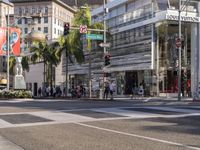 A sunny day in Los Angeles, California. Modern architecture lines the streets, with residential areas and shops creating a vibrant urban design. Palm trees sway against clear skies as pedestrians cross the zebra crossings and traffic lights guide the way.