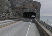 a tunnel and road running into the ocean with an ocean in the background on a gloom day