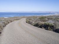 an empty paved road with shrubs on the shore in front of the ocean and an expanse of water