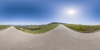 a panorama fisheye lens picture with the sky above it and mountains behind it with one person riding a skateboard on it