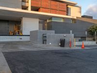 Early morning in Los Angeles, California. The concrete road casts a hard shadow on the art center building. Red caution cones line the residence and parking lot. A unique urban scene at dawn.