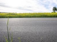 This is an image of a rural road in California, USA. The cloudy, grey sky creates a gloomy atmosphere as it casts a shadow over the landscape. The road, made of asphalt and tar, stretches through a lush field of yellow flowers and green vegetation. The surrounding nature and agriculture add to the beauty of this scenic view. It is daytime, and the soft light of dawn illuminates the scene. This photo captures the essence of a peaceful and natural rural setting in California.
