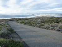 A picturesque road winds along the coast of California, USA, overlooking the ocean shore on an overcast day. The asphalt road curves through the highlands, surrounded by lush vegetation and grass. The scenic landscape showcases the natural beauty of the area, with trees dotting the horizon and the sea extending into the distance. The wild and untouched shoreline is a perfect escape into nature, offering a serene and peaceful environment. The cloud-filled sky adds to the dramatic atmosphere, reflecting the break of day as dawn approaches. This stock photo captures the essence of California's coastal wilderness.
