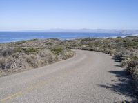 A scenic coastal road in California, winding through Montaña de Oro State Park. The low headlands and azure blue ocean create a breathtaking landscape. The clear sky and vegetation add to the beauty of the road.