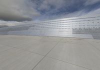 This is an image taken in California, USA. It shows the architecture of an open space area near the sea. The concrete floor and metal walls of the hangar and blastwall are visible. The industrial setting creates a unique atmosphere with the cloud-filled horizon in the background. The photo represents a relaxing vacation experience in California. Visitors can enjoy the spaciousness of the area and the connection to the sea. It is a perfect location for those interested in aviation as the airport and airfield are nearby.