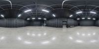 a skate park has concrete floors and light fixtures overhead the floor is shiny gray and white