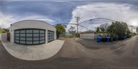 the fish - eye lens photo shows a view of a small garage and several trash bins