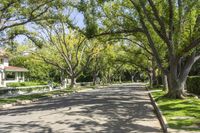 A sunny day in Palm Springs, Florida, USA. The street is lined with trees and bushes, casting hard shadows. The clear sky and lush vegetation create a picturesque suburban setting.