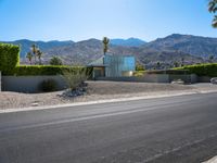 A modern architectural masterpiece nestled in the Sonora Desert of Palm Springs, California. This suburban villa showcases mid-century design with clean lines and stunning mountain views. The palm trees and clear blue sky complete the picture-perfect day.