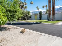 A modern residential home in Palm Springs, California. Surrounded by lush greenery and palm trees, the house is nestled in a suburban neighborhood. The clear sky and Sonora Desert in the background add to the scenic view.