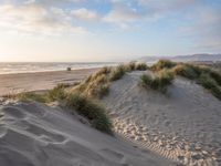 sand dunes with grass on an empty beach near the ocean in california, usa, during sunset
