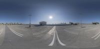 an empty parking lot with sun going down and buildings in the distance at the back