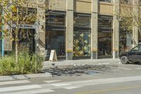 Modern architecture in the heart of Los Angeles, California. The bustling city street features a glass-fronted building surrounded by trendy shops, cafes, and storefronts. The vibrant urban design captures the essence of city life.
