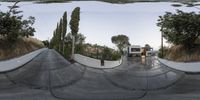 A modern apartment building in Los Angeles, California. The circular panorama captures the drama of the city's architecture against a clear sky. Trees and vegetation grow at the side, adding a touch of nature to the urban landscape.